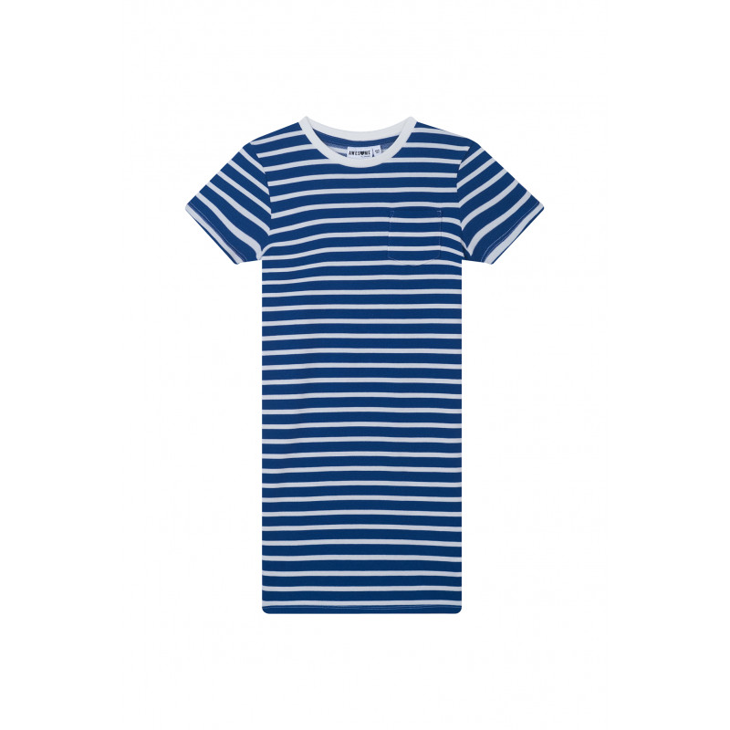 Donkerblauwe midi-jurk met ecru strepen all over en een borstzakje. Samenstelling : 50% VISC 50% POL