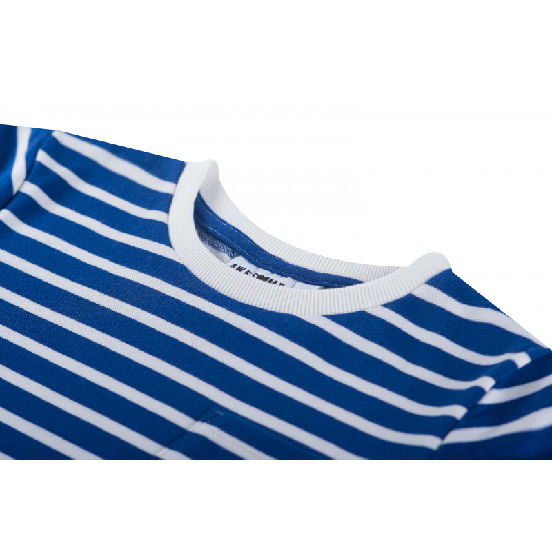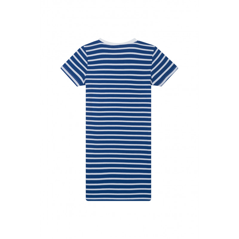 Robe midi bleu foncé à rayures écrues sur l'ensemble et poche poitrine. Composition : 50 % viscose, 50 % polyester.