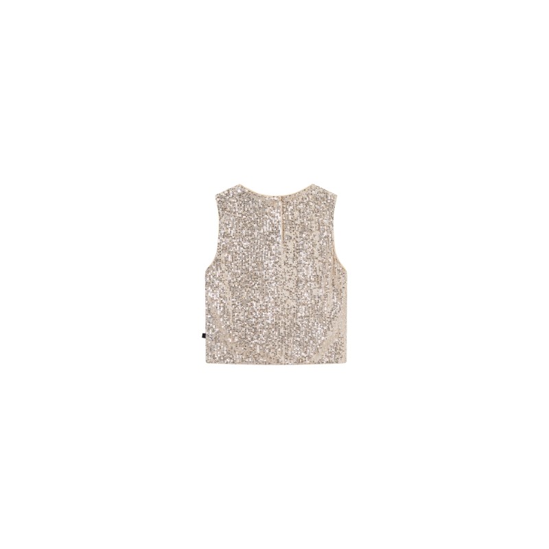 Top beige clair entièrement orné de sequins. Composition : 50 % viscose, 50 % polyester.