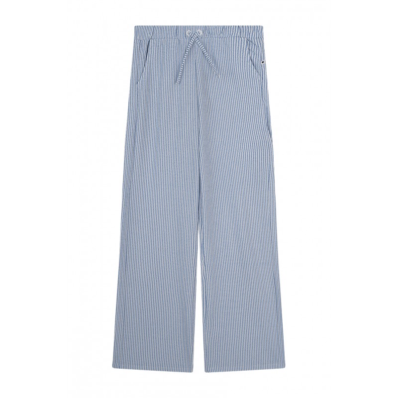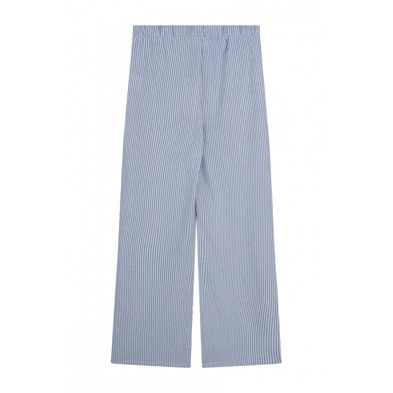 Pantalon avec ceinture côtelée rayée en tricot nylon. Composition : 50 % viscose, 50 % polyester.