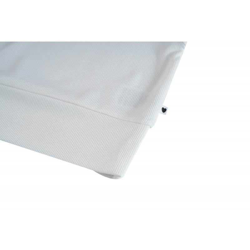 Haut court côtelé écru avec finition babylock. Composition : 50 % viscose, 50 % polyester.