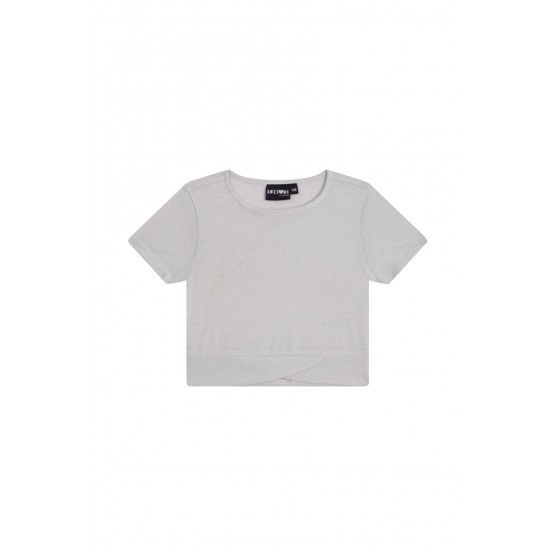 Haut court côtelé écru avec finition babylock. Composition : 50 % viscose, 50 % polyester.