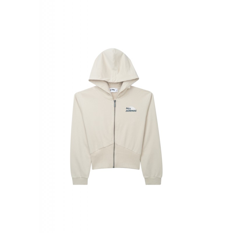 Cropped lichtbeige sweatvest met capuchon, ritssluiting en ribboord aan de manchetten en onderboord. Samenstelling : 50% VISC 50% POL