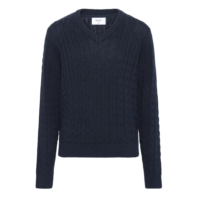 Pull Aron à col en V, en maille torsadée, bords côtelés et manches longues.