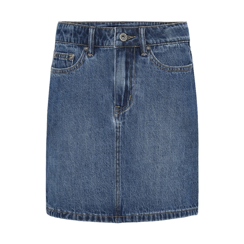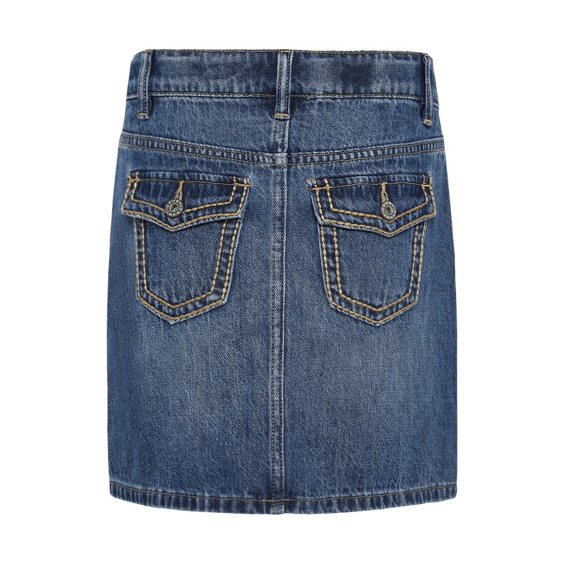 Jupe en jean bleu Roma, cinq poches et fermeture éclair sur le devant. Coupe slim. Composition : 95 % coton, 5 % viscose.