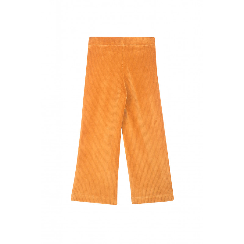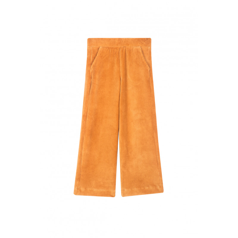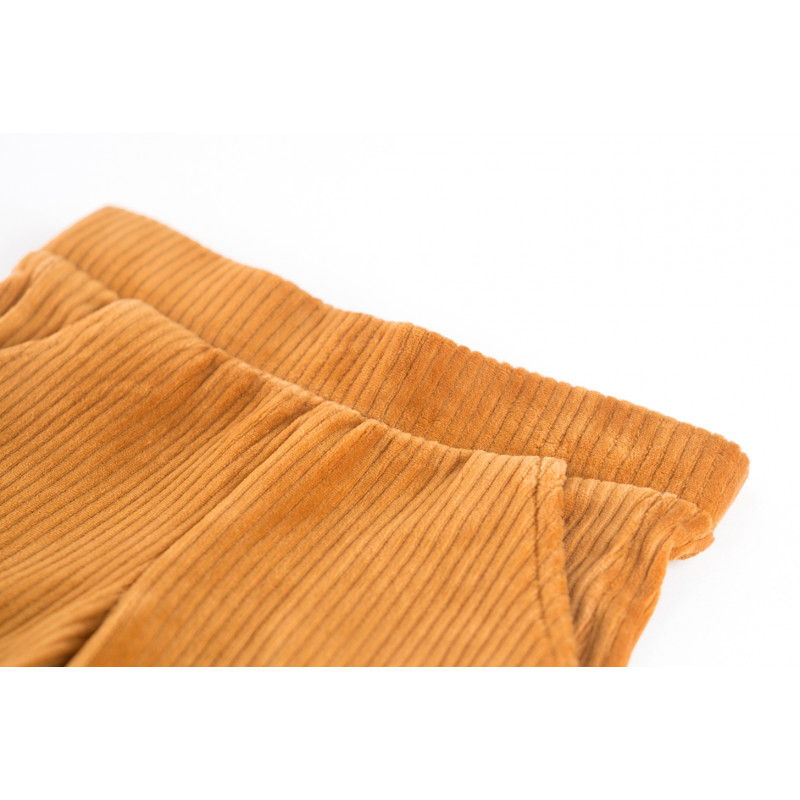Pantalon en velours côtelé couleur cognac avec taille élastique du même tissu. Composition : 60 % coton, 35 % polyester, 5 % polyester.