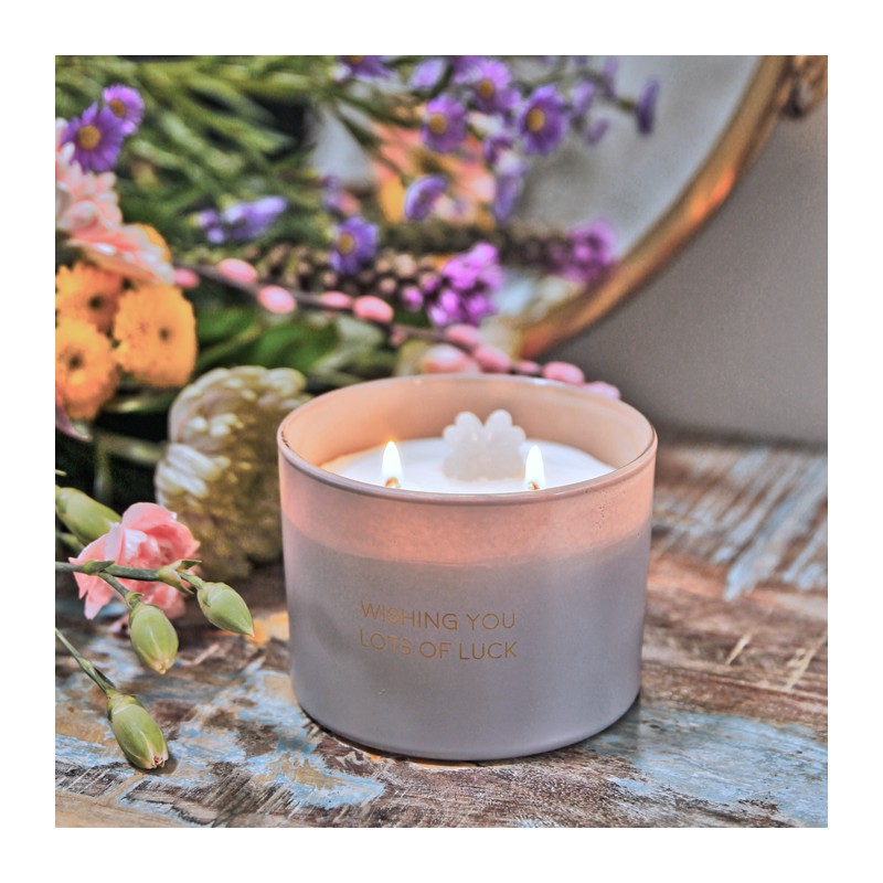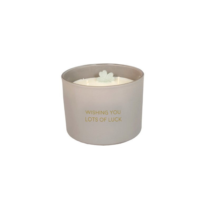 Une délicieuse bougie parfumée à la cire de soja biologique. À l'intérieur, un trèfle à quatre feuilles en cire est gravé. L'inscription « Je te souhaite beaucoup de chance » est imprimée en lettres dorées.