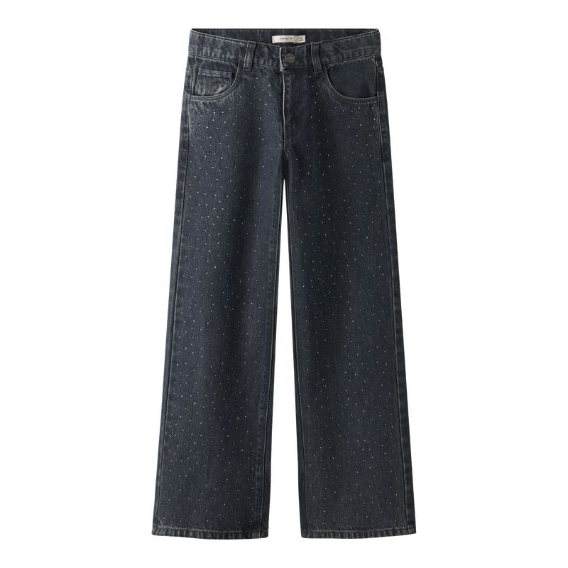 Les vêtements en denim tendance sont indispensables à la garde-robe de chaque enfant. Que vous préfériez les looks tendance ou les pièces intemporelles, votre enfant est assuré de trouver des modèles doux et de qualité pour toutes les occasions et toutes les saisons.Le denim est une matière tissée résistante, disponible en différentes versions pour un look unique.- Type de produit : Jean coupe large- Fermeture : Agrafe, bouton et braguette- Poches : Poches arrière, Poches avant, Poche à monnaie- Détails : Strass- Délavage/Finition : Aspect légèrement usé- Coupe : Ce jean a une taille standard et des jambes larges. Composition : 80 % coton, 20 % coton - Recyclé