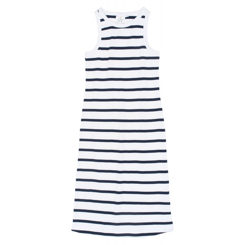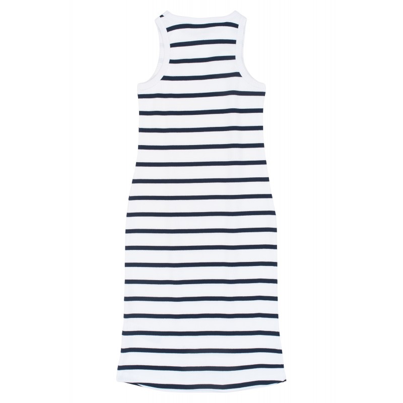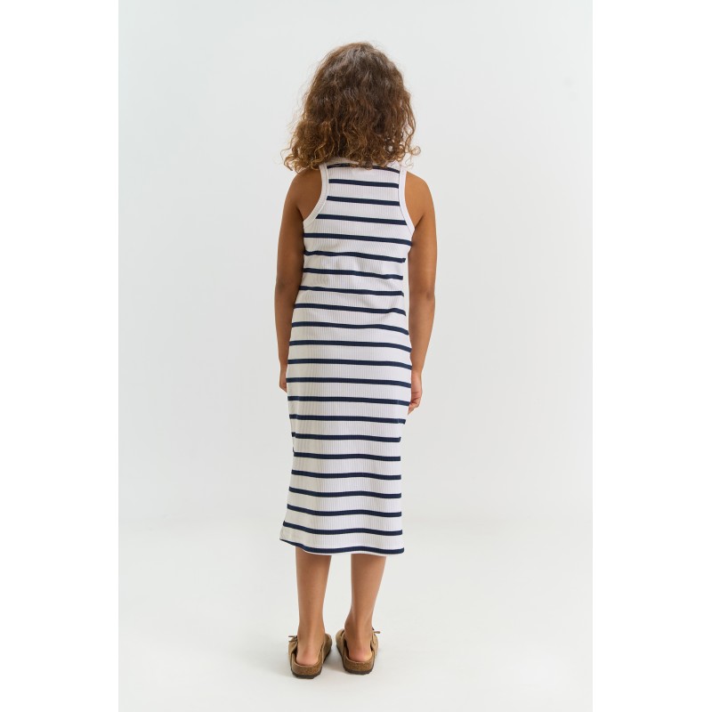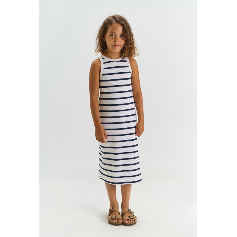 Cette robe à manches courtes pour filles est composée à 95 % de coton et à 5 % d'élasthanne pour une coupe près du corps et extensible. Elle présente un motif à rayures horizontales dans des tons pastel doux, une encolure ras du cou avec un bord-côte et une petite bretelle décorative sur une épaule. Sa coupe droite et près du corps offre une grande...
