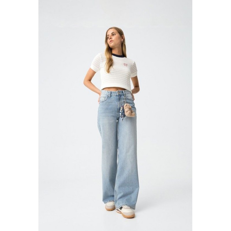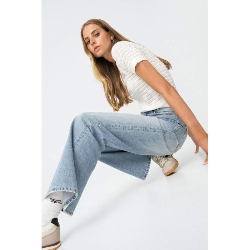 Pantalon large taille haute à cinq poches. Fermeture devant par zip et bouton métallique. Ourlet effiloché.