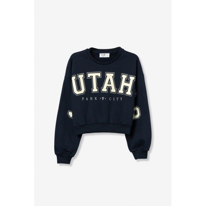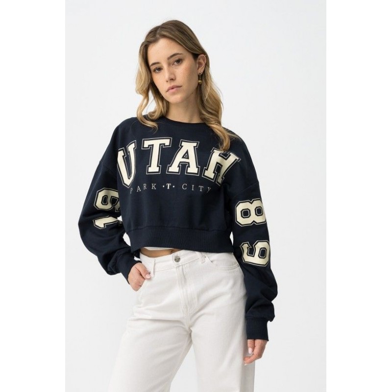 Sweat-shirt court bleu marine à inscription audacieuse, manches longues et coupe décontractée pour un style casual.