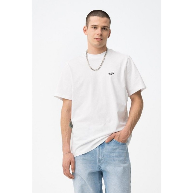 T-shirt blanc coupe classique avec imprimé noir audacieux au dos et petit logo sur le devant.