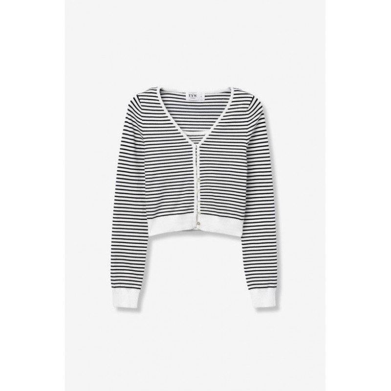 Cardigan en maille ajustée à rayures noires et blanches, manches longues et boutons sur le devant, pour un style décontracté chic.