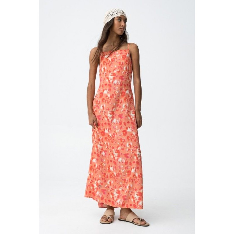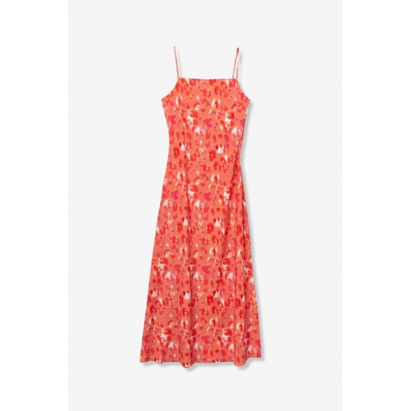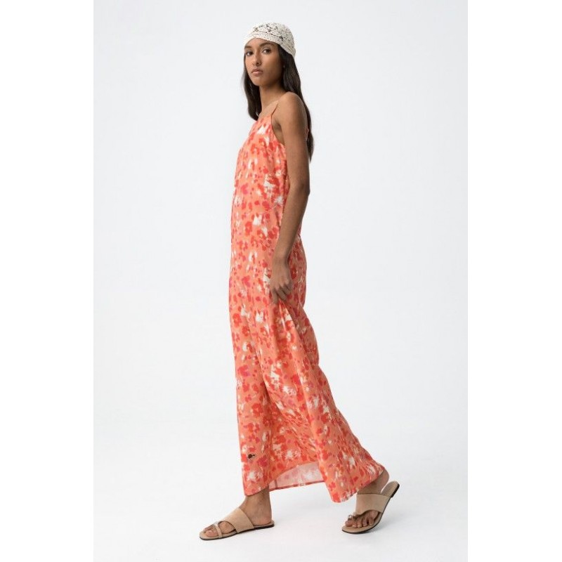 Robe longue ample couleur corail à imprimé floral, fines bretelles, légère et fluide.