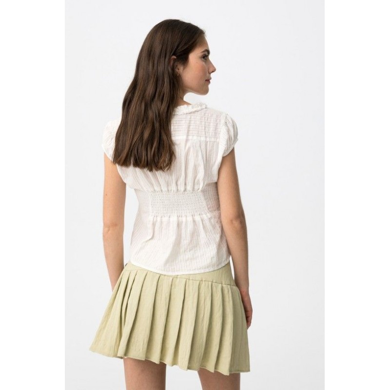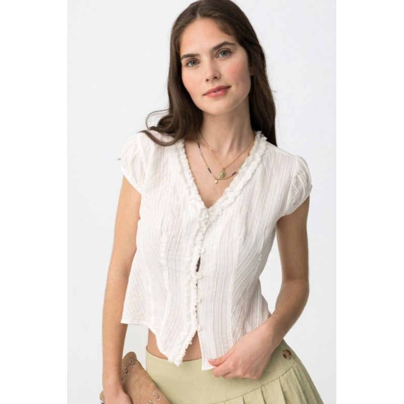 Top crème court à coupe droite, en maille côtelée, manches courtes et col V froncé.
