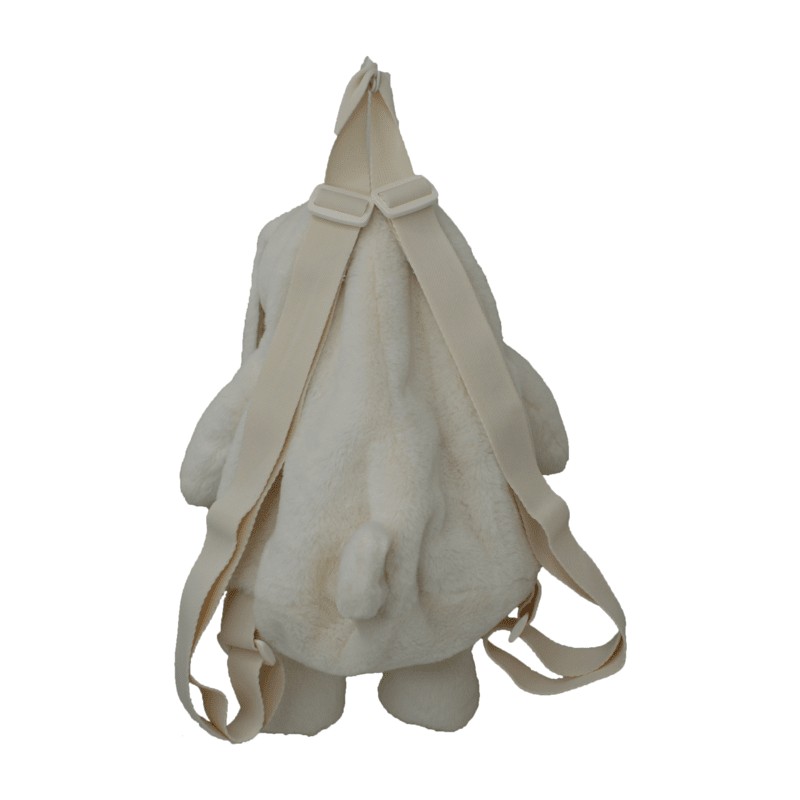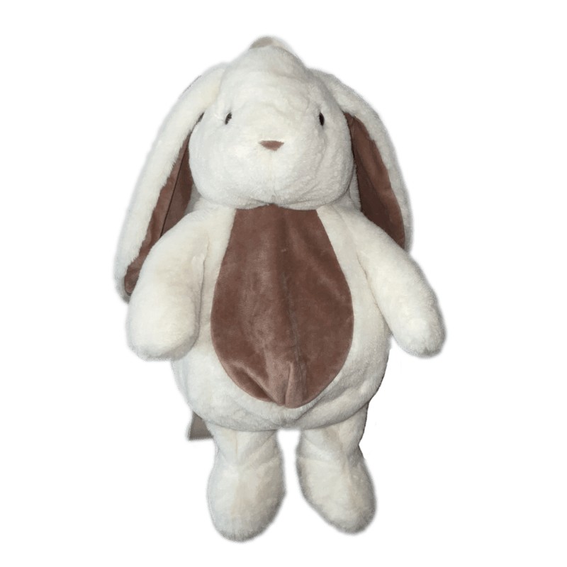 Le sac à dos lapin marron et blanc présente un design pelucheux avec un devant marron chocolat et un extérieur blanc vanille.