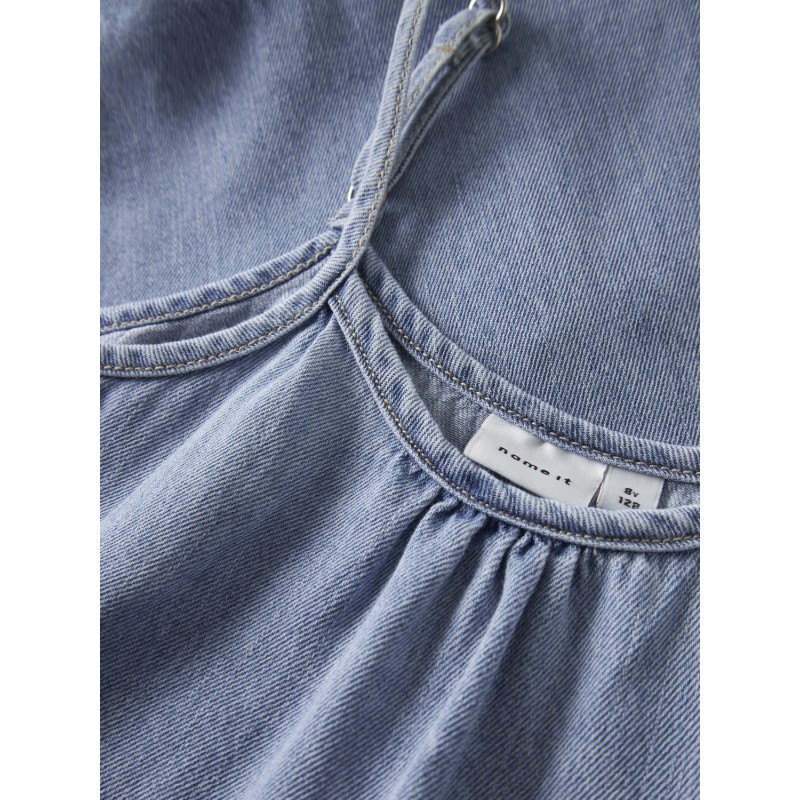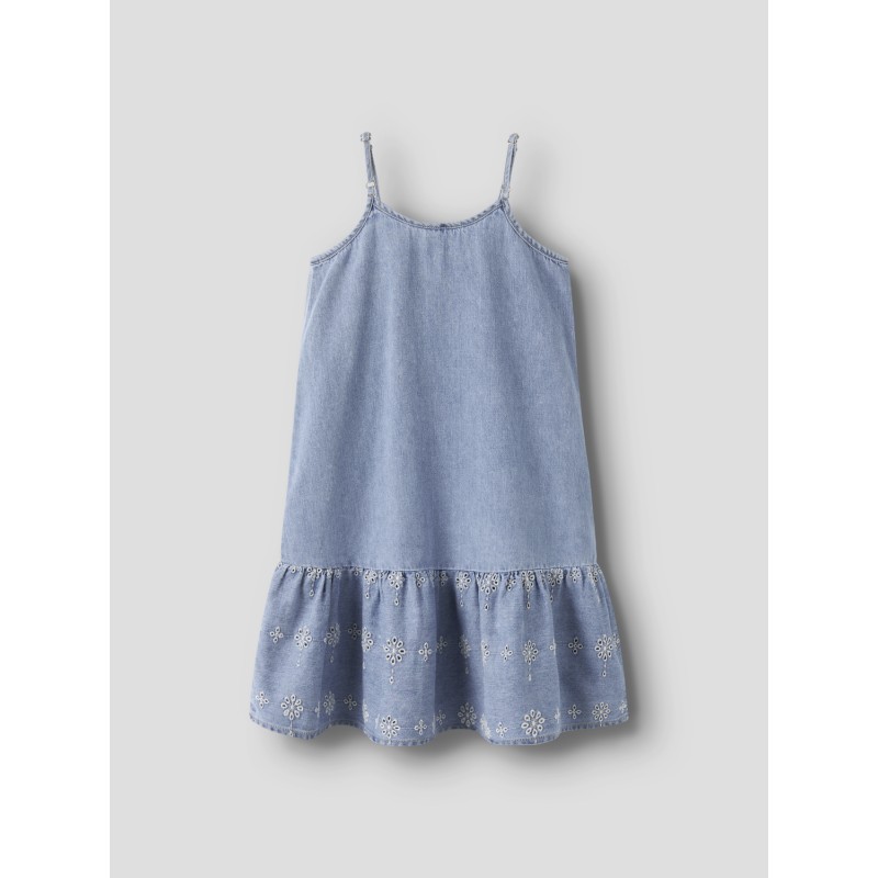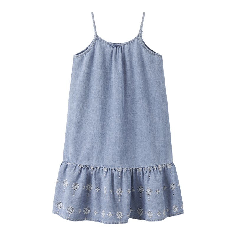 Cool denim wear is a must-have in any child´s wardrobe, and whether you prefer trendy looks or timeless pieces, your child is ensured soft, quality styles for all occasions and seasons.Denim is a durable woven fabric available in several expressions for a unique look. - Product Type : Denim dress - Neck : U-Neck - Sleeve : Sleeveless - Straps : Adjustable straps - Extra details : Broderie anglaise detail - Wash/Finish : Subtle abrasions - Fit : Loose Fit Compound : 80% Cotton, 20% Cotton - Recycled