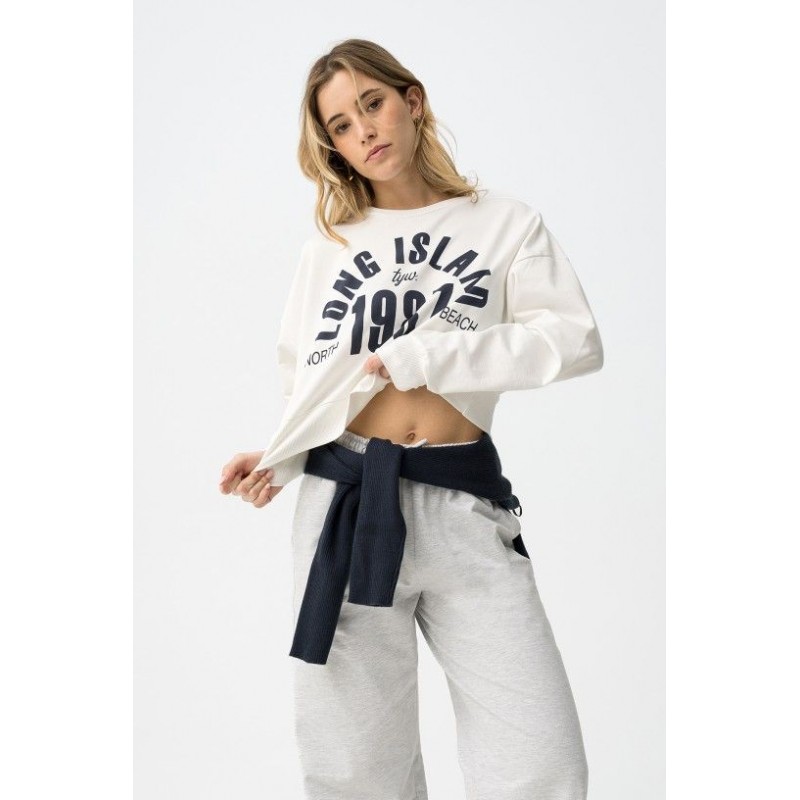Navy cropped sweatshirt with bold lettering, long sleeves, and relaxed fit for casual style.