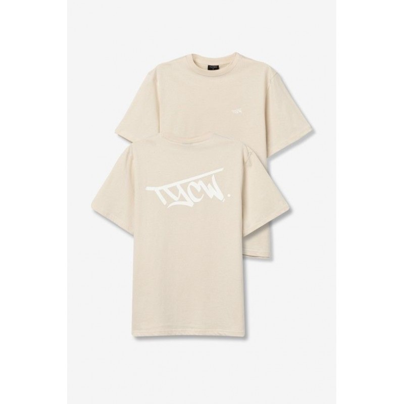 Regular fit white tee with bold black back print and small front logo detail.