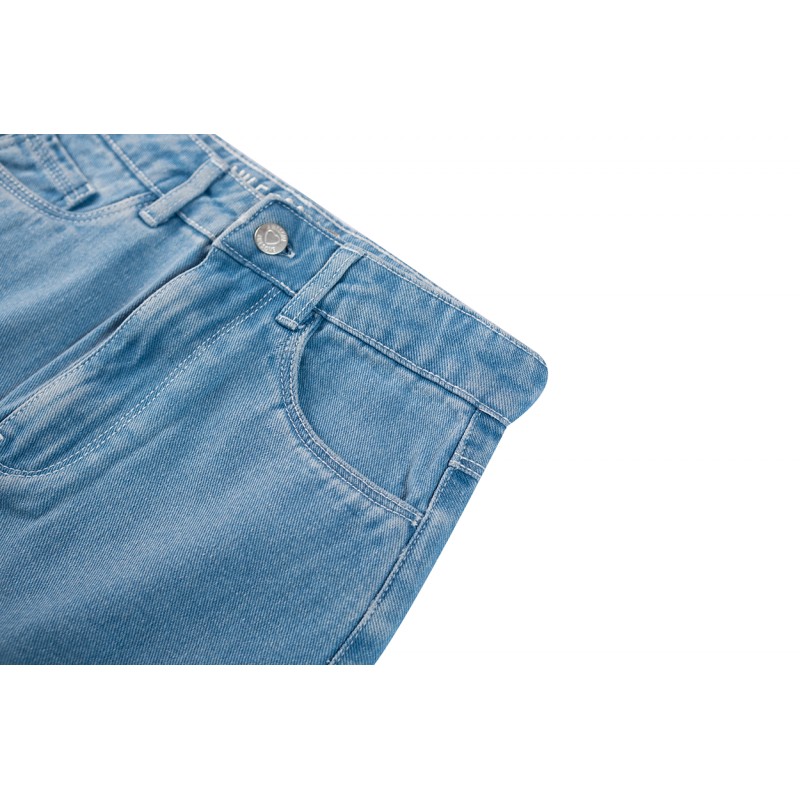 Denimblauwe short met steekzakken en achterzakken. Samenstelling : 50% VISC 50% POL