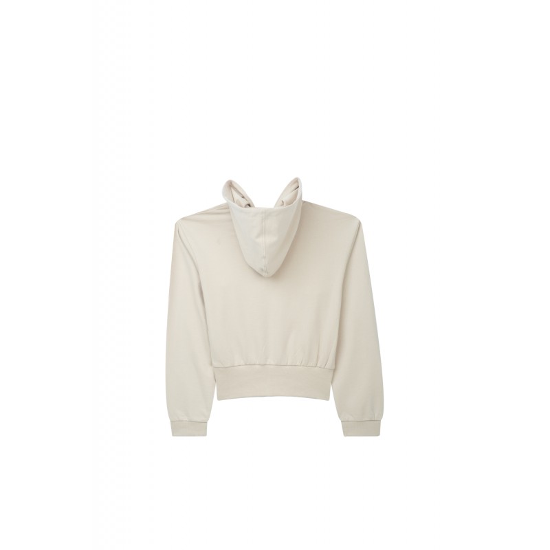 Cropped lichtbeige sweatvest met capuchon, ritssluiting en ribboord aan de manchetten en onderboord. Samenstelling : 50% VISC 50% POL