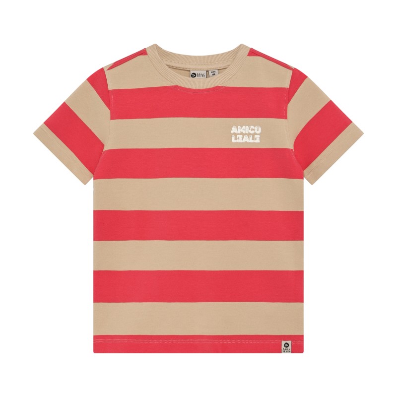 T-shirt van Daily7Kids. Het T-shirt heeft een all-over streepjesprint en de kraag is effen in een contrasterende kleur. Gemaakt van gecertificeerd biologisch katoen. Gecertificeerd volgens GOTS - biologisch CERES-0366