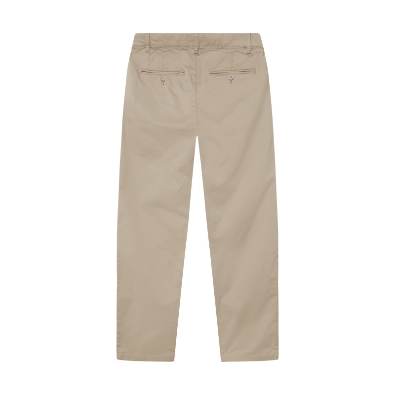 Chinobroek met schuine zakken, ritssluiting en paspelzakken op de achterkant.