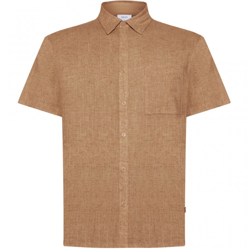 Vap linnen overhemd met knoopsluiting, korte mouwen en kraag. Normale pasvorm. Samenstelling: 82% katoen, 18% linnen.