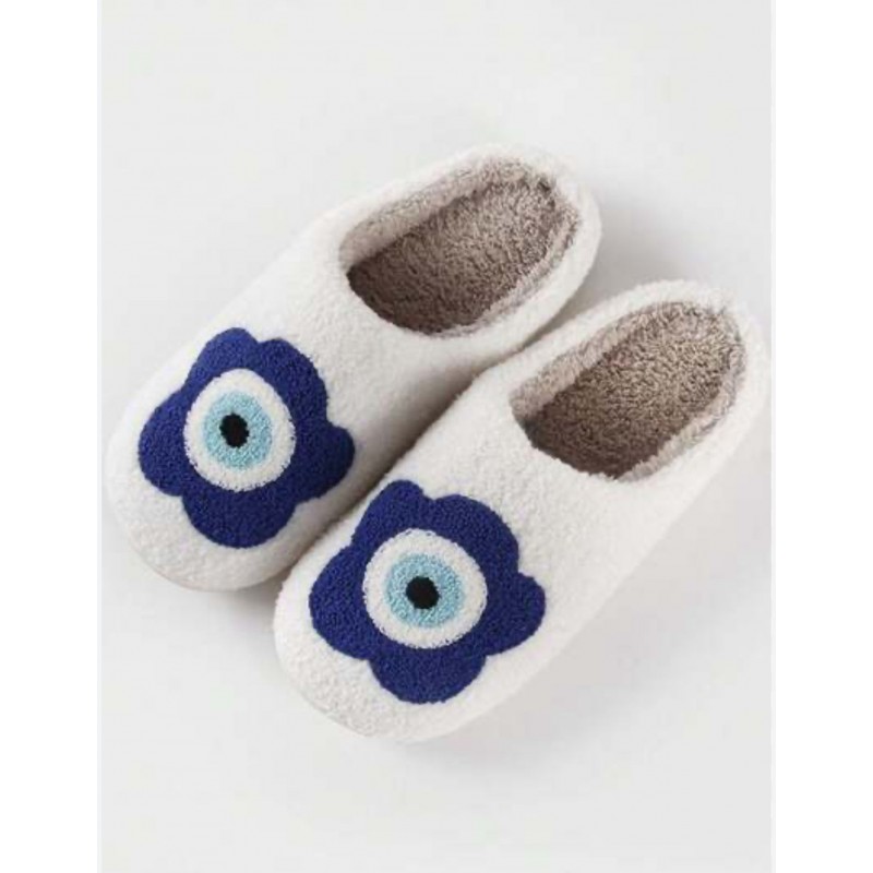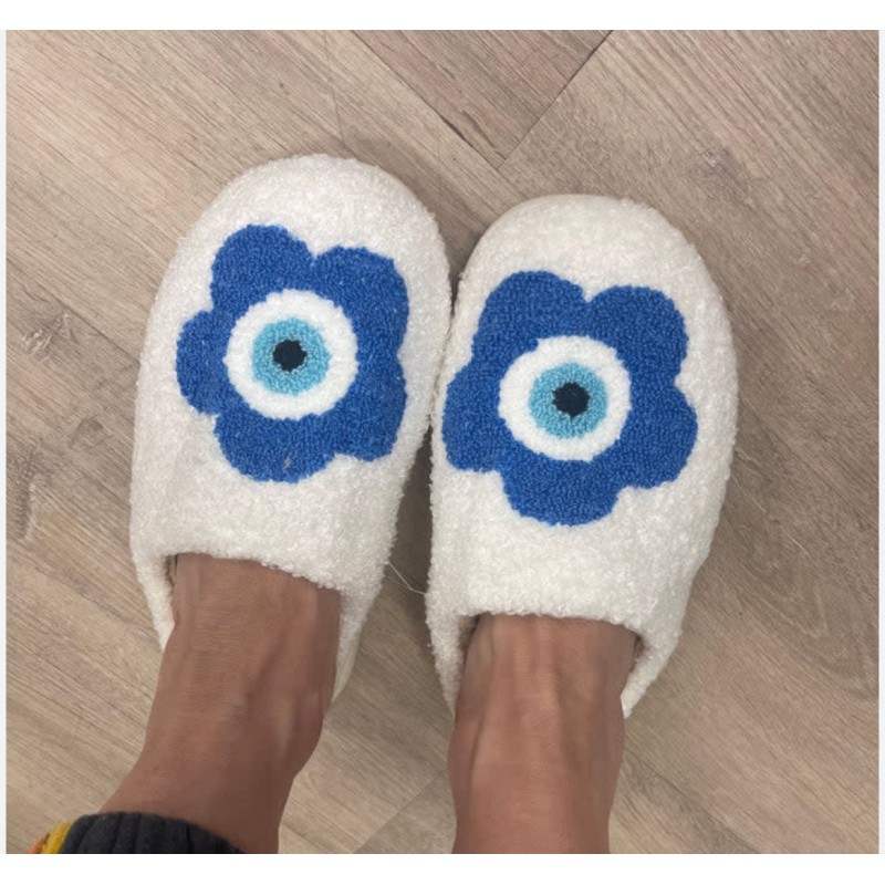 Pantoffels met blauwe bloem op wit !!! Ze zijn enorm comfortabel en warm zijn. Hierdoor kun je heerlijk ontspannen na een dag lang lopen of gewerkt te hebben.