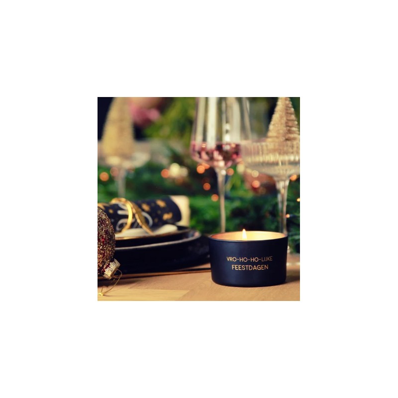 Te leuke geurkaars. De kaars is gemaakt van biologische sojawas en heeft de geur Winter Wood. Op het glas staat de tekst; Vro-ho-ho-lijke feestdagen. Een super leuk cadeau voor de kerst. De kaars brandt ca. 30 uur.