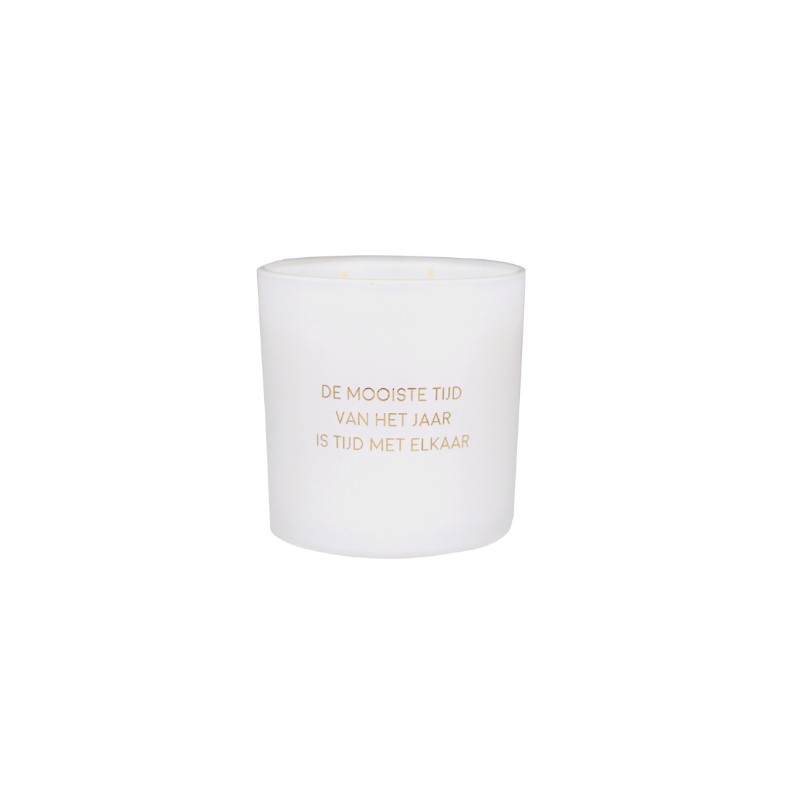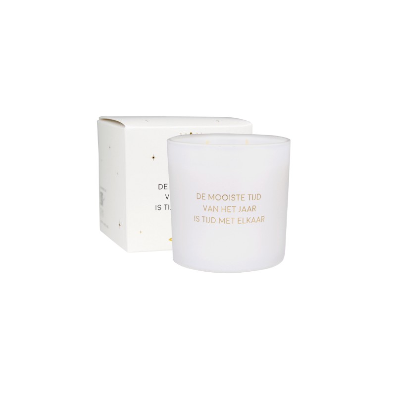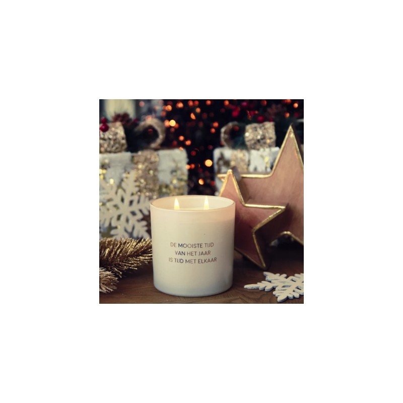 Op de geurkaars staat 'De mooiste tijd van het jaar is tijd met elkaar'. Een super leuk cadeau voor de kerst.