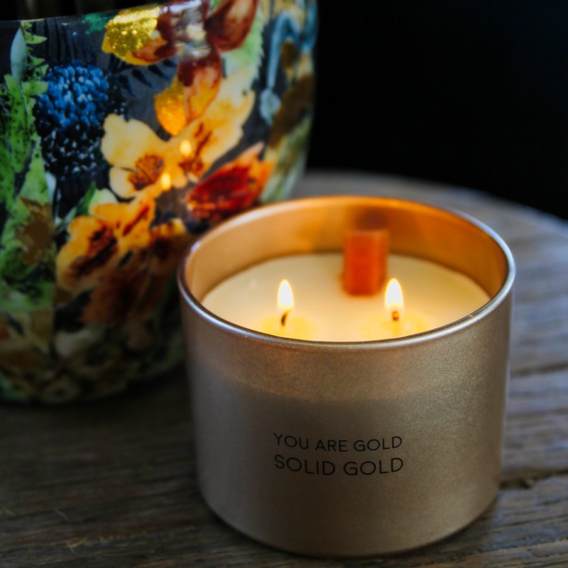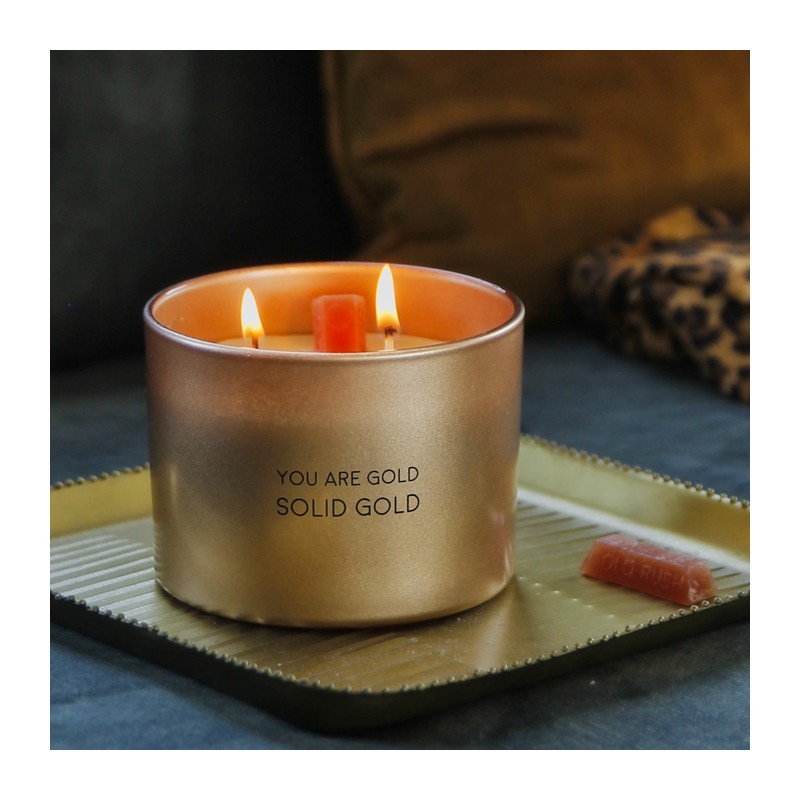 Een heerlijke geurkaars gemaakt van biologische sojawas met een goudstaafje gemaakt van was erin. Deze kaars heeft de geur Silky tonka en brandt ca. 75 uur.