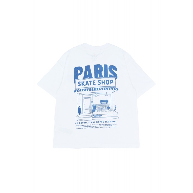 - Kleine blauwe print op de borst met “PARIS SKATE SHOP”