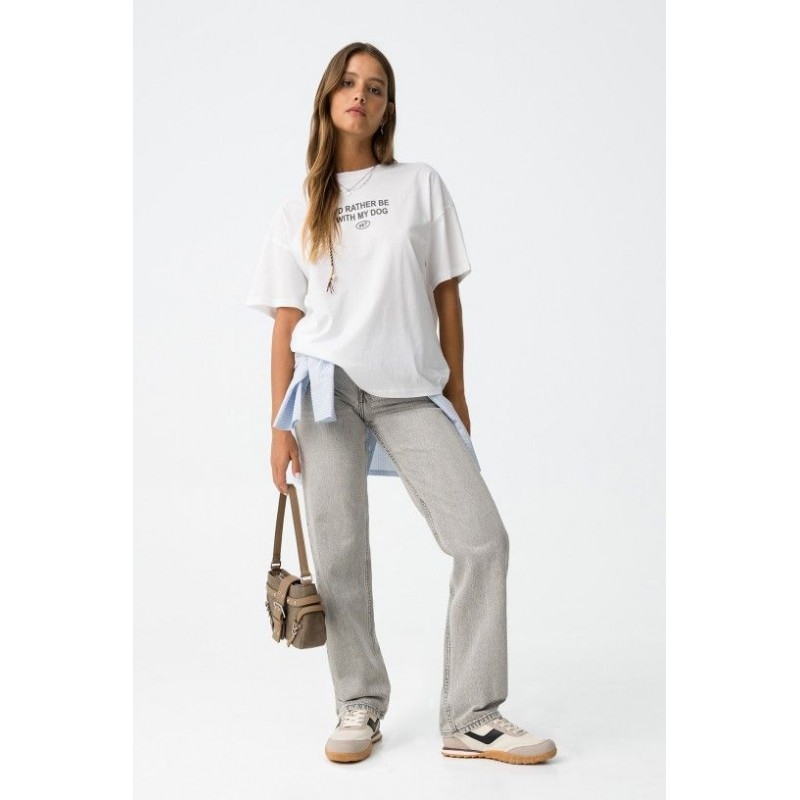 Rechte jeans met hoge taille en vijf zakken. Ritssluiting aan de voorkant en metalen knoop.