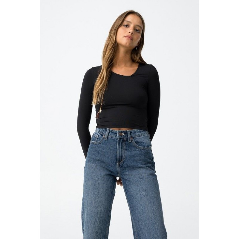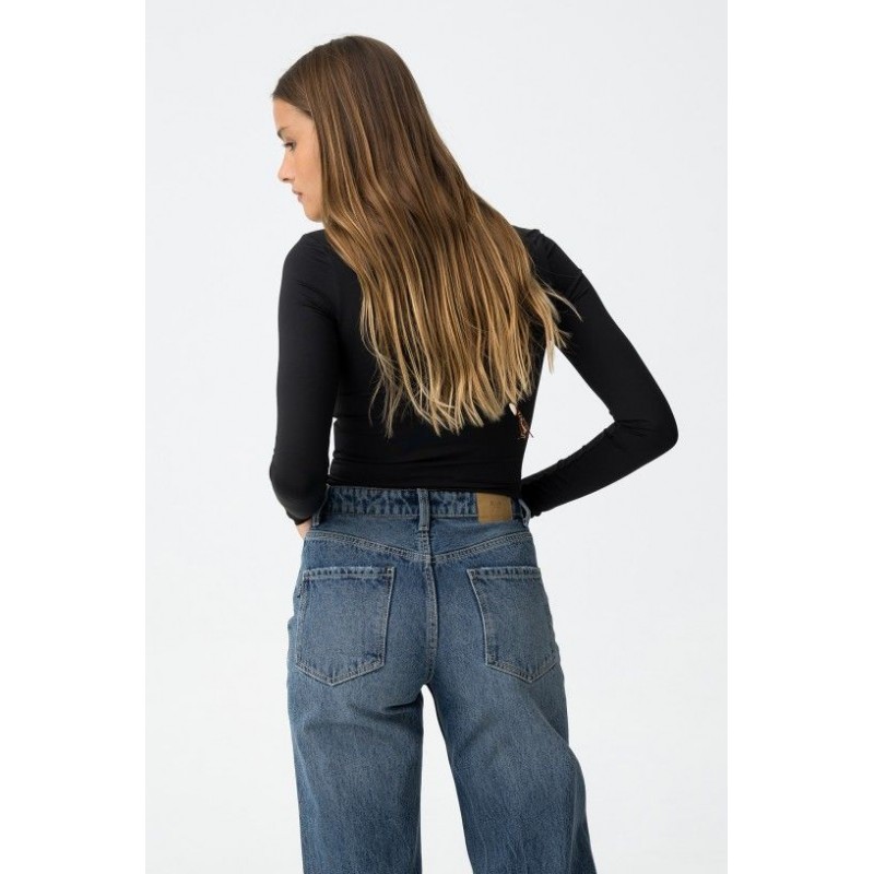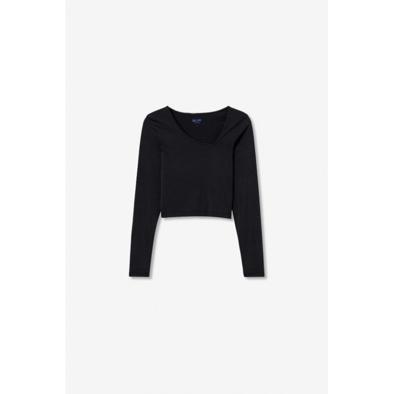 Superslank zwart T-shirt met asymmetrische halslijn, lange mouwen en een korte zoom.