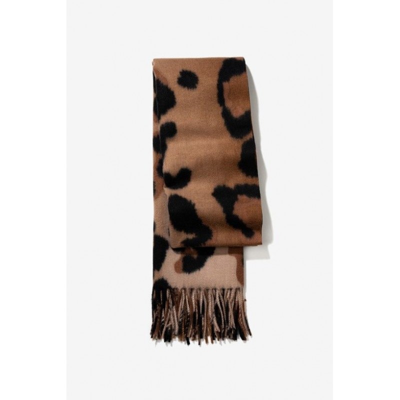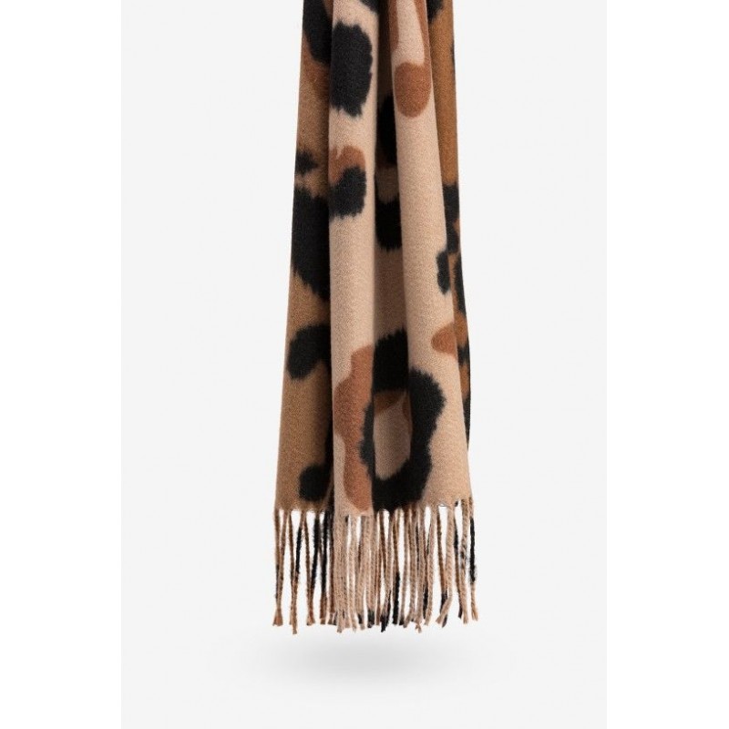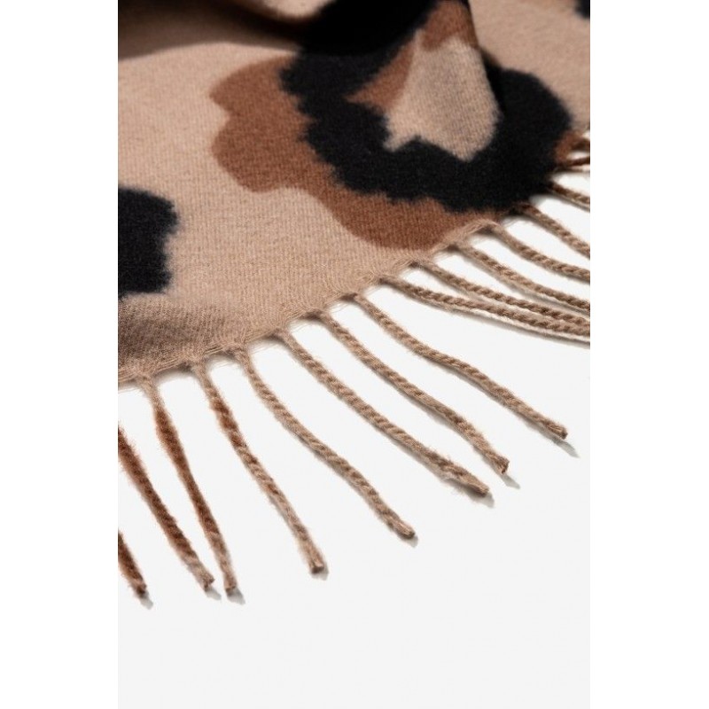 Bedrukte sjaal met geborstelde textuur en gerafelde randen.
