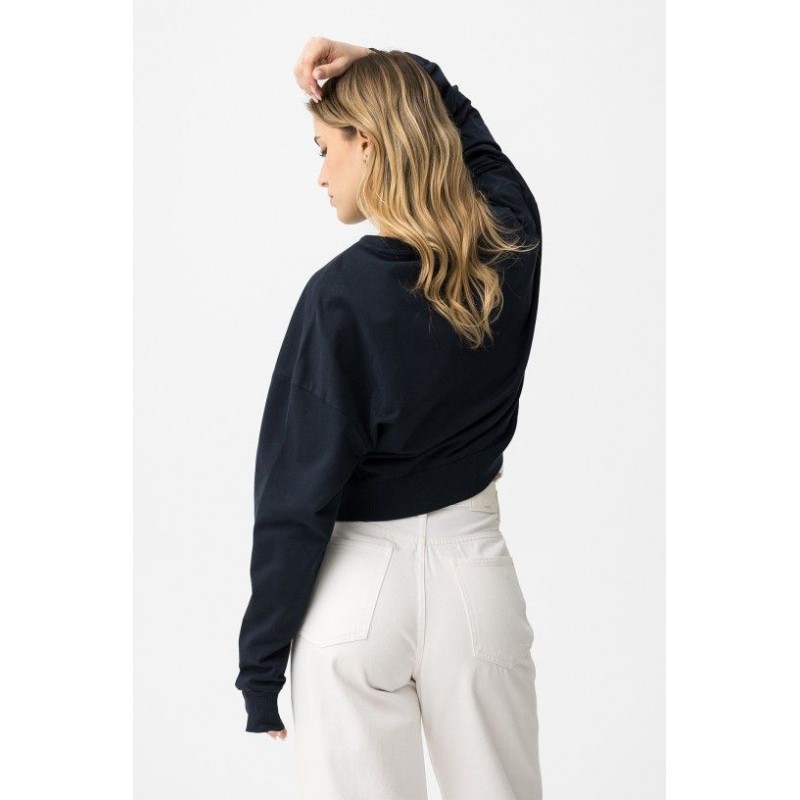 Donkerblauwe cropped sweater met opvallende letters, lange mouwen en een relaxte pasvorm voor een casual stijl.