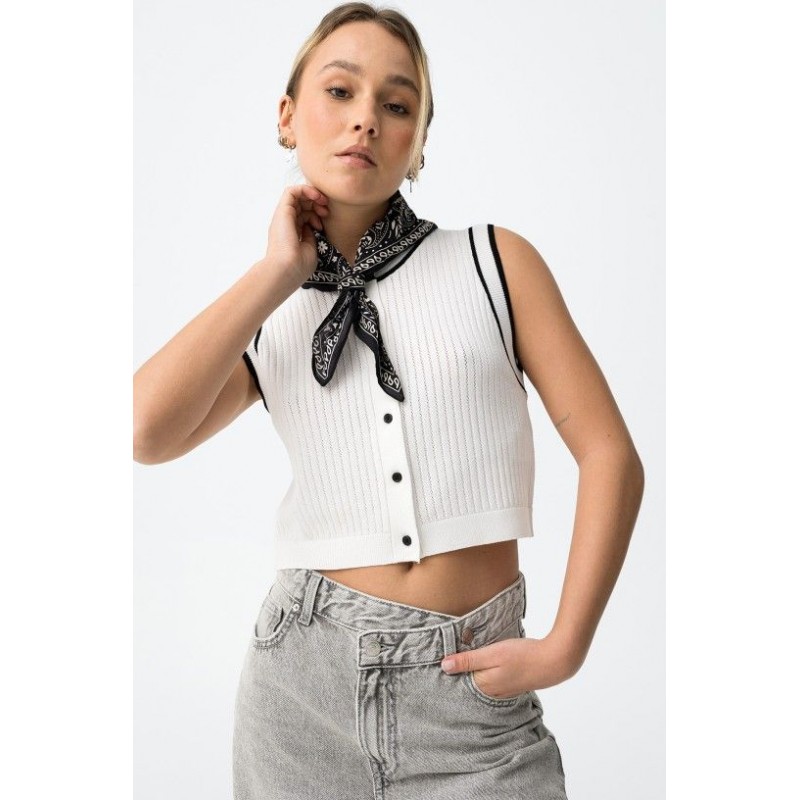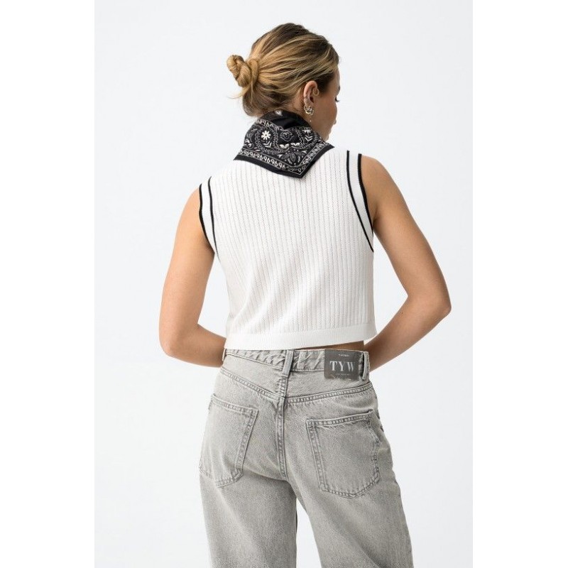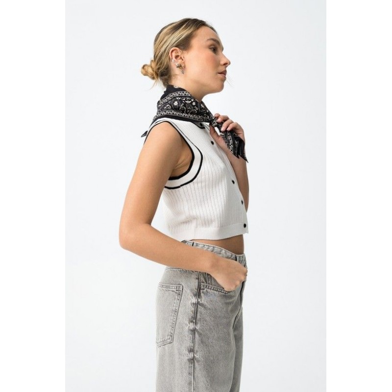 Witte, korte gebreide gilet/top met korte mouwen, zwarte bies, knoopjes aan de voorkant en een normale pasvorm.