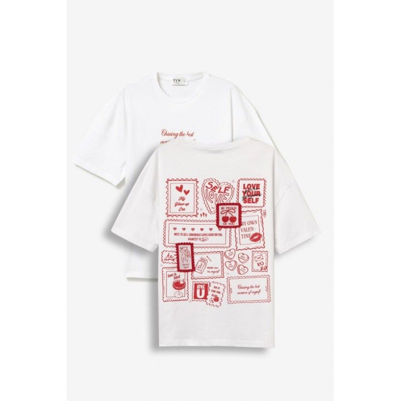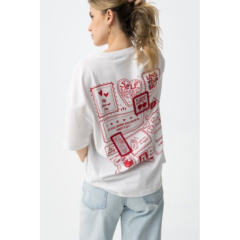Oversized wit T-shirt met rode grafische print en korte mouwen, casual en trendy stijl.